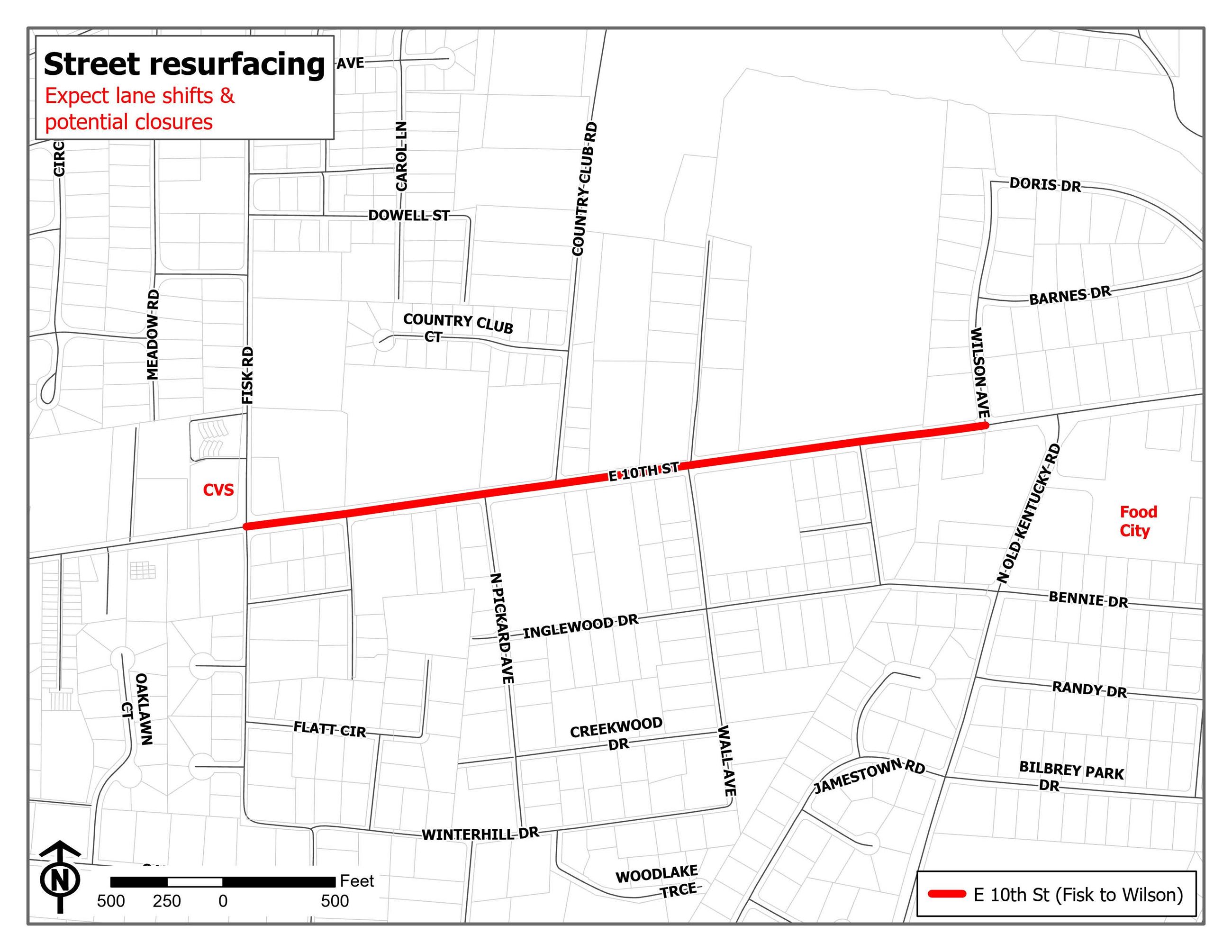 Street resurfacing on East 10th Street will begin at 6 a.m. tomorrow, July 3, between Fisk Road and Wilson Avenue. Drivers should anticipate lane shifts and potential lane closures while work is taking place.