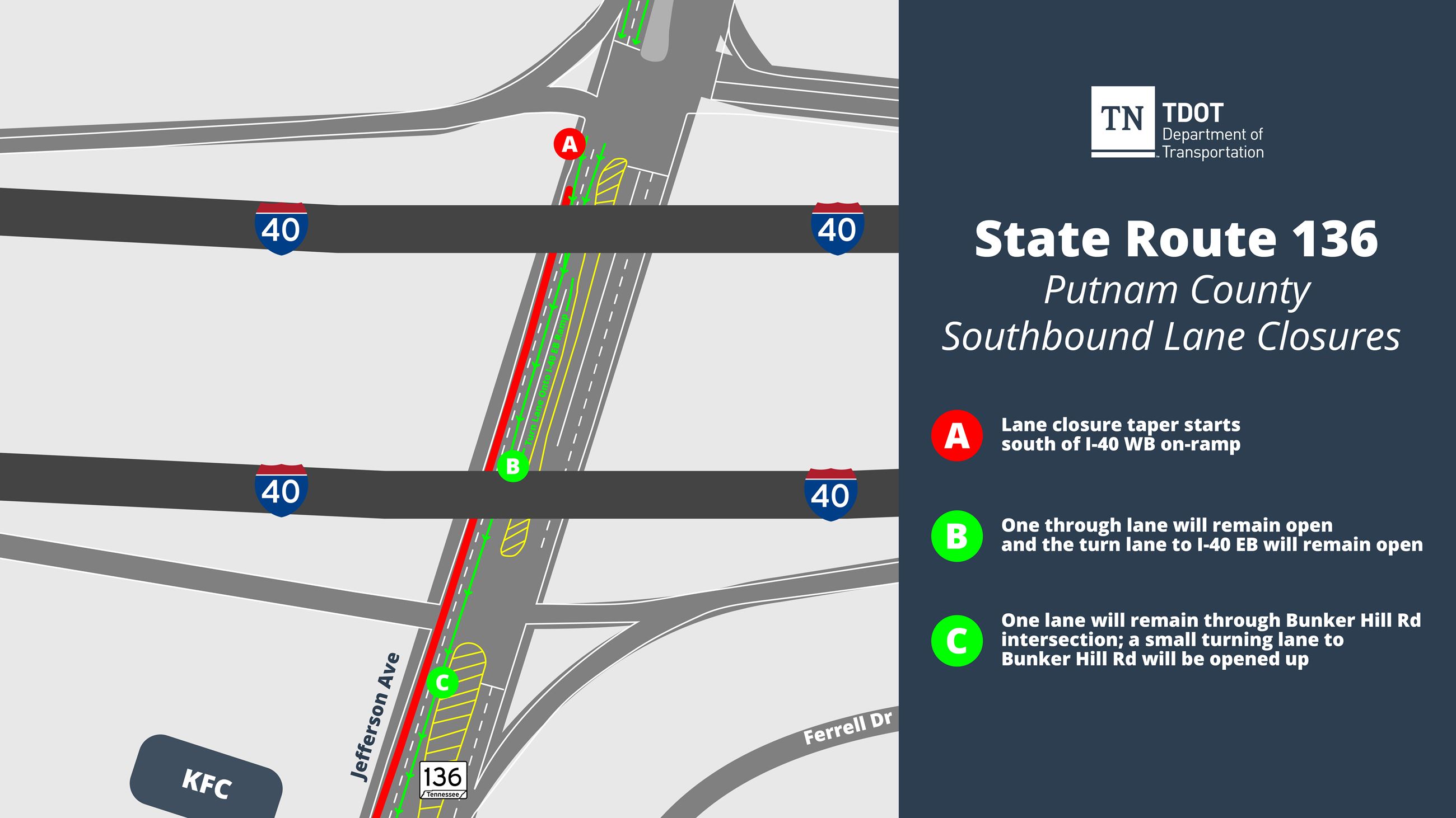 Drivers traveling along SR 136 (South Jefferson Avenue) in Cookeville should be aware of upcoming road construction activities that will impact traffic. As part of the 2.3-mile project to widen and improve SR 136 from I-40 to SR 111, Tennessee Department of Transportation contract crews will implement lane closures on South Jefferson Avenue in both directions near the I-40 interchange beginning Wednesday, August 13, 2025, and continuing through October 31, 2025.