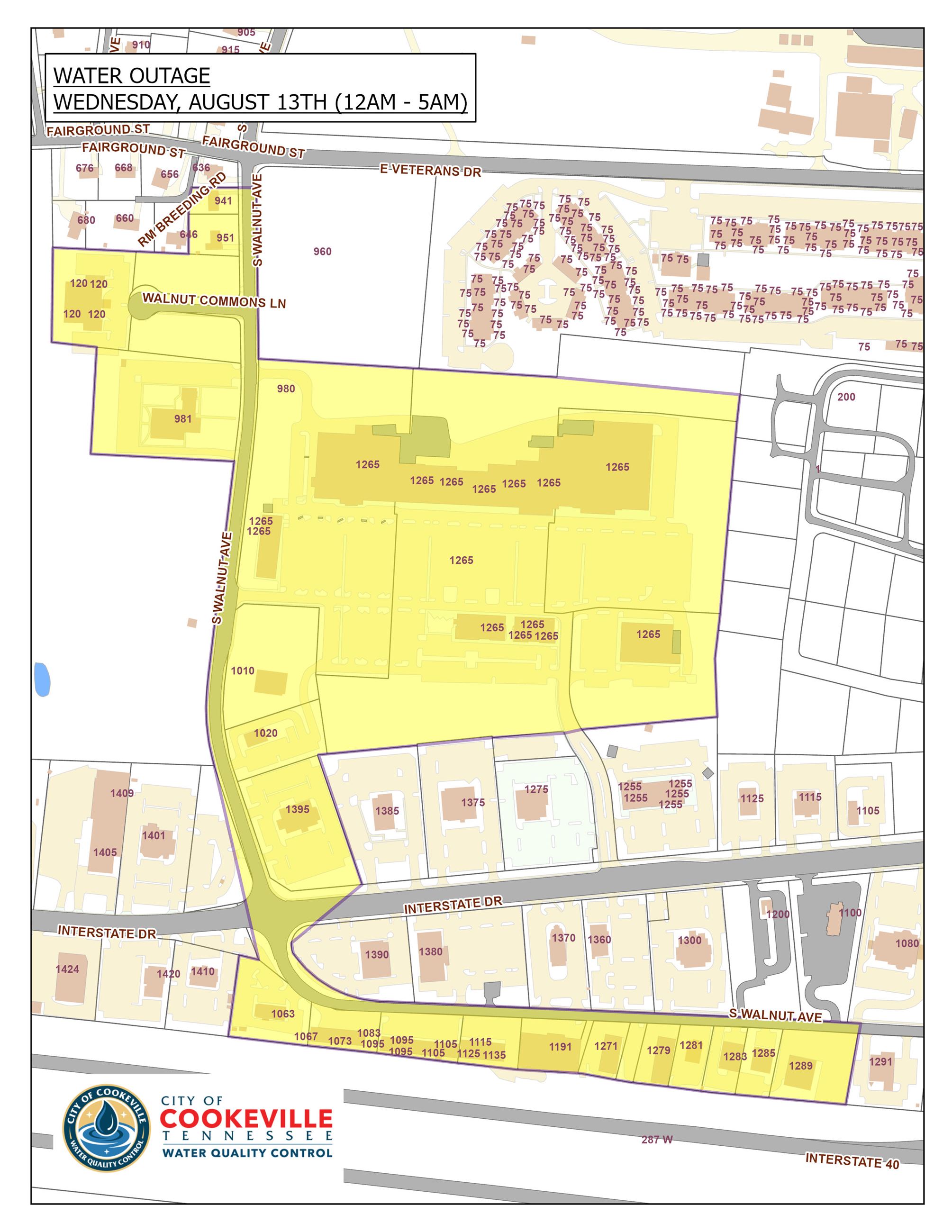 On Wednesday, August 13, the City of Cookeville will have water services off in the area of South Walnut Avenue between East Veterans Drive and Interstate Drive. Please refer to the attached map to see which addresses will be affected.