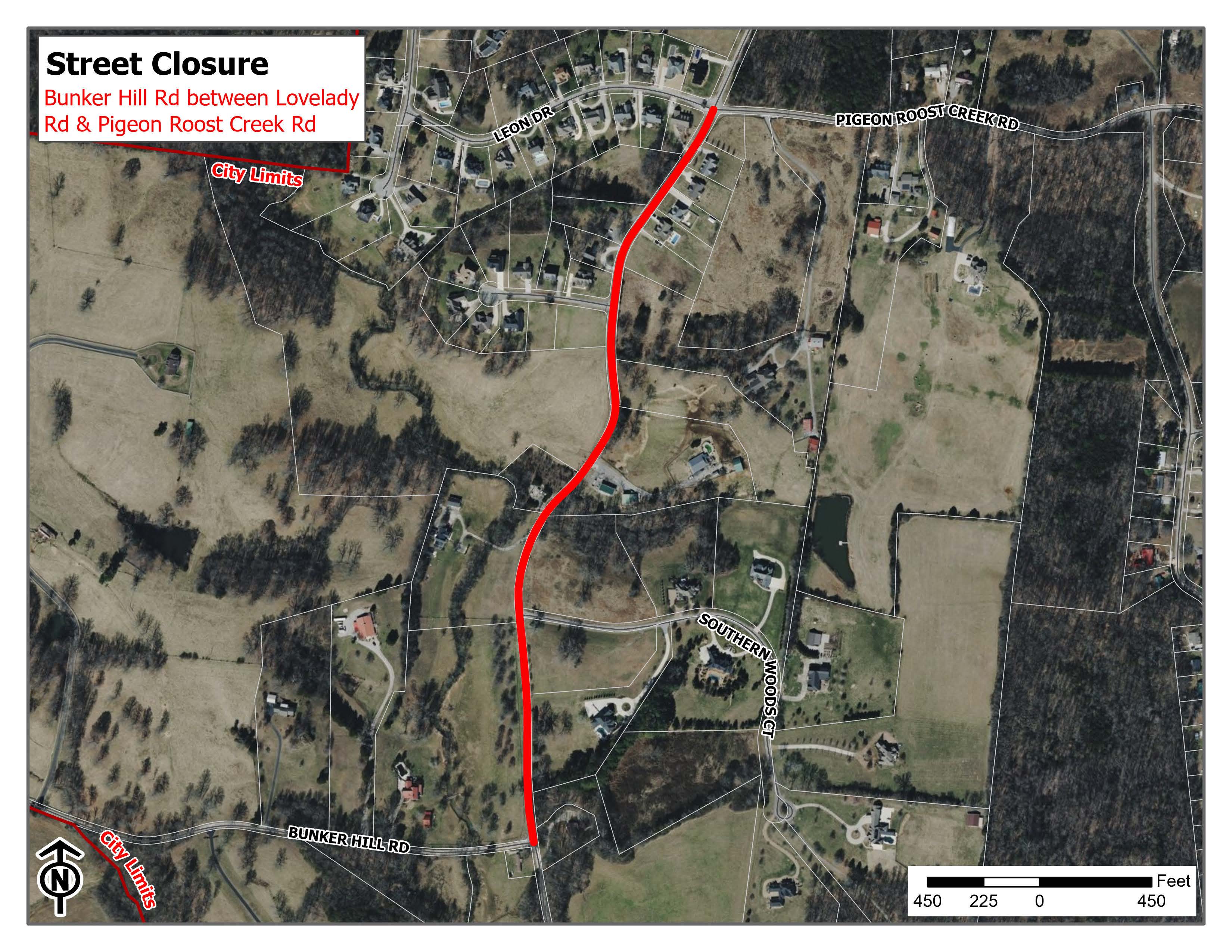 Bunker Hill Road, between Lovelady Road and Pigeon Roost Creek Road, will be closed to all traffic starting at 8:00 a.m. on Thursday, August 28. Work crews will be on site to replace a storm drain. The street is expected to reopen once work is completed Thursday evening.