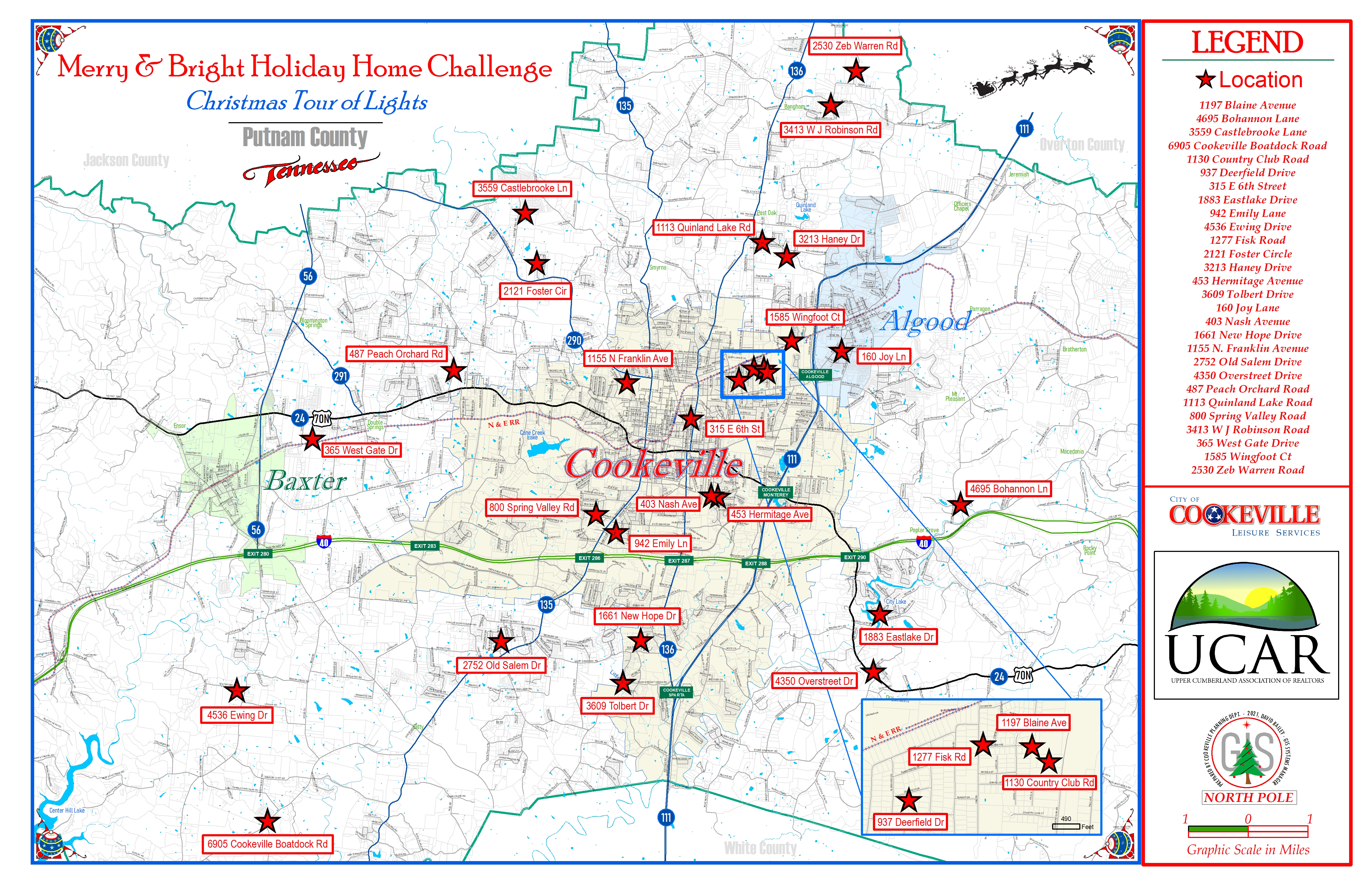 The Merry and Bright Tour of Lights map is available at the Cookeville Municipal Building, 45 E. Broad St., and HERE. For more information, call 931-520-4386.