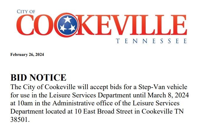 The City of Cookeville will accept bids for a Step-Van vehicle for use in the Leisure Services Department until March 8, 2024 at 10am in the Administrative office of the Leisure Services Department located at 10 East Broad Street in Cookeville TN 38501.