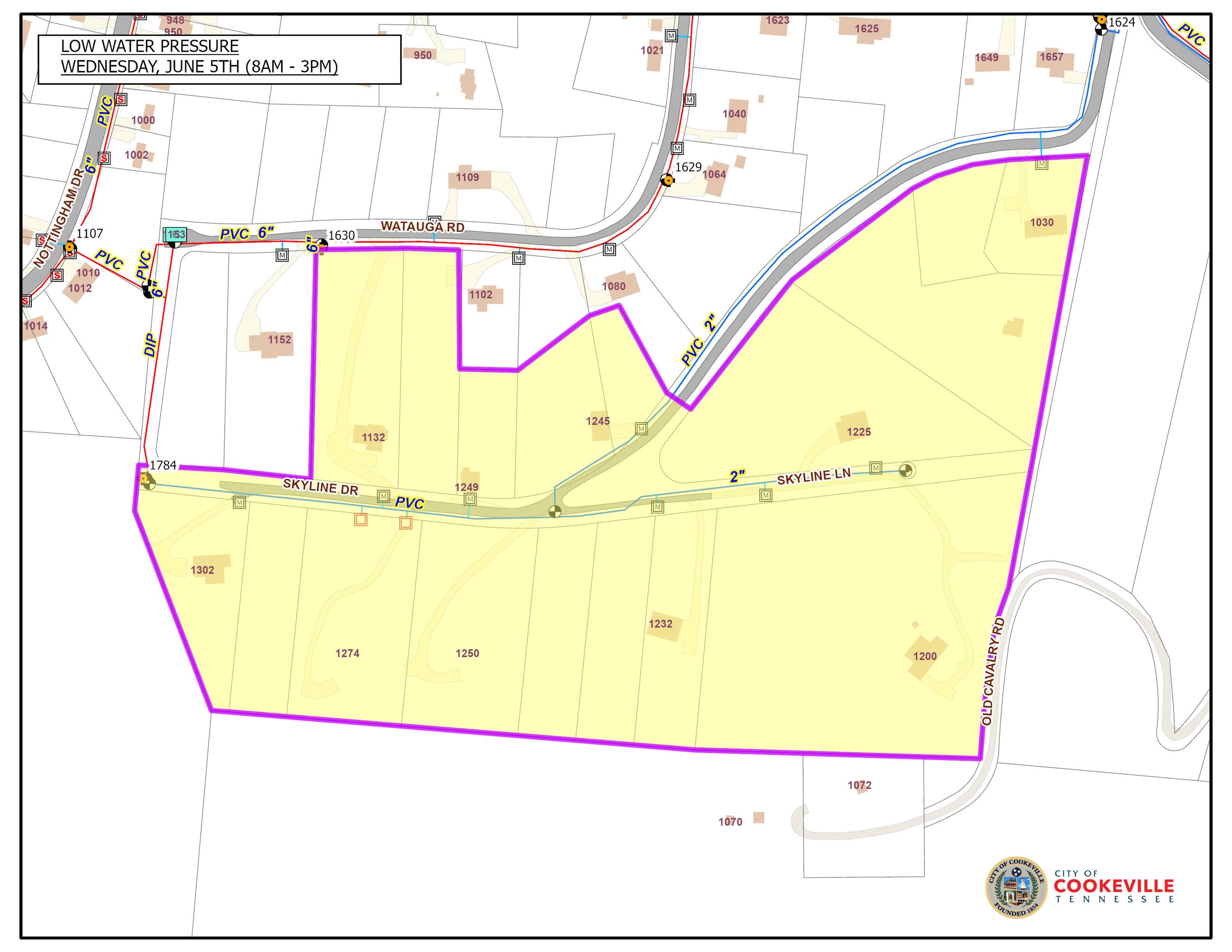 The Watauga pump station will undergo maintenance tomorrow, June 5, from approximately 8 a.m. to 3 p.m. During this time, residents in the Skyline Drive and Skyline Lane area may experience intermittent low water pressure. If you have any questions, you may call the Cookeville Water Department at 931-520-5239. Thank you for your patience.