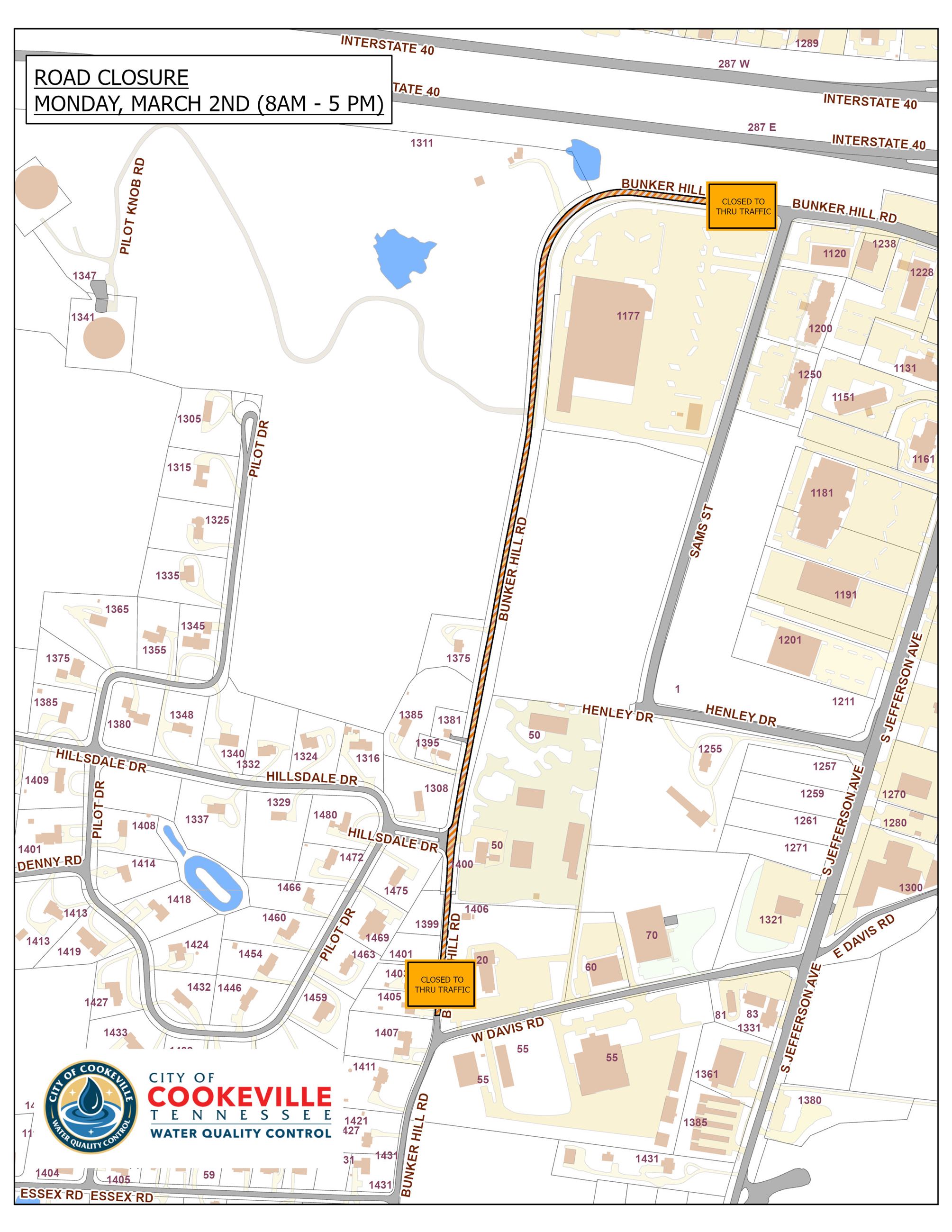 The City of Cookeville Department of Water Quality Control will have Buker Hill Road closed to thru traffic between West Davis Road and Sams Street as a contractor works in the area. The closure will occur on Monday, March 2nd from approximately 8 am to 5 pm. For questions, please call, 520-5227.