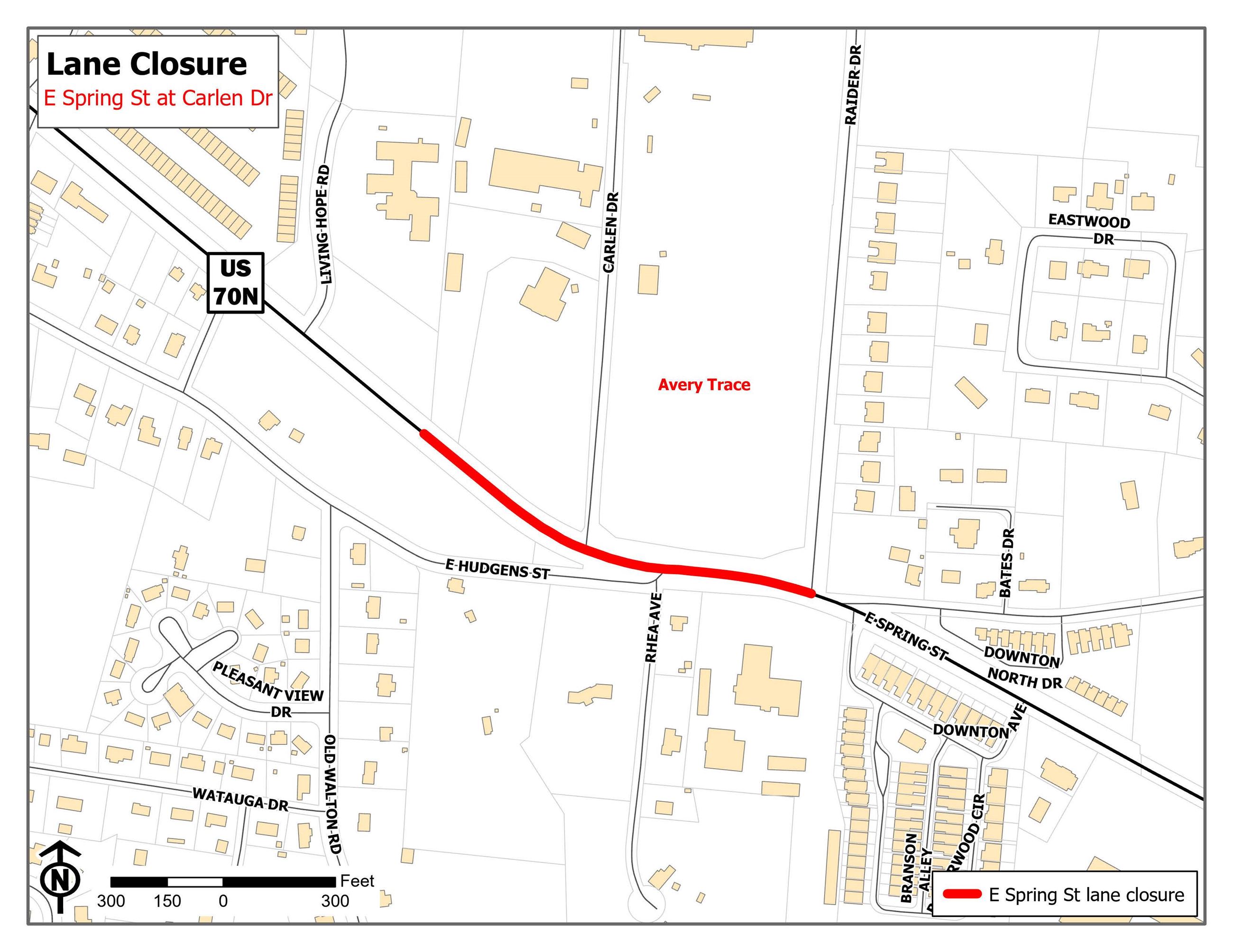 The westbound lane of East Spring Street, in the vicinity of Carlen Drive and Raider Driver, will be closed from 6 a.m. on Tuesday, July 22, to the end of day Wednesday, July 23.