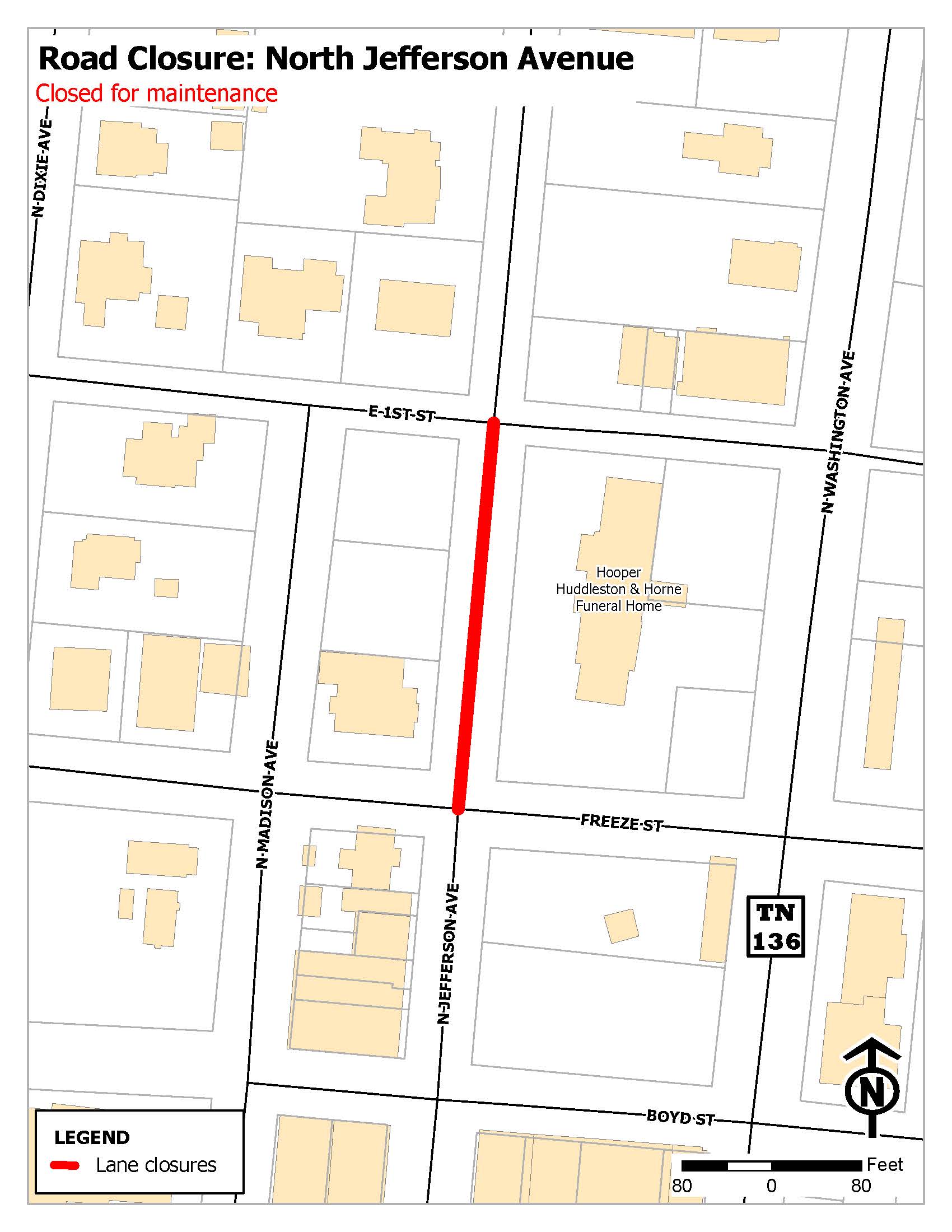 The portion of North Jefferson Avenue between East 1st Street and Freeze Street is closed for vital repairs. We are working to fix the issue and reopen the street in a timely manner. A specific timeline is not yet available for the street's reopening. Drivers should plan their routes accordingly. We appreciate your patience and support while this repair is underway. Thank you.