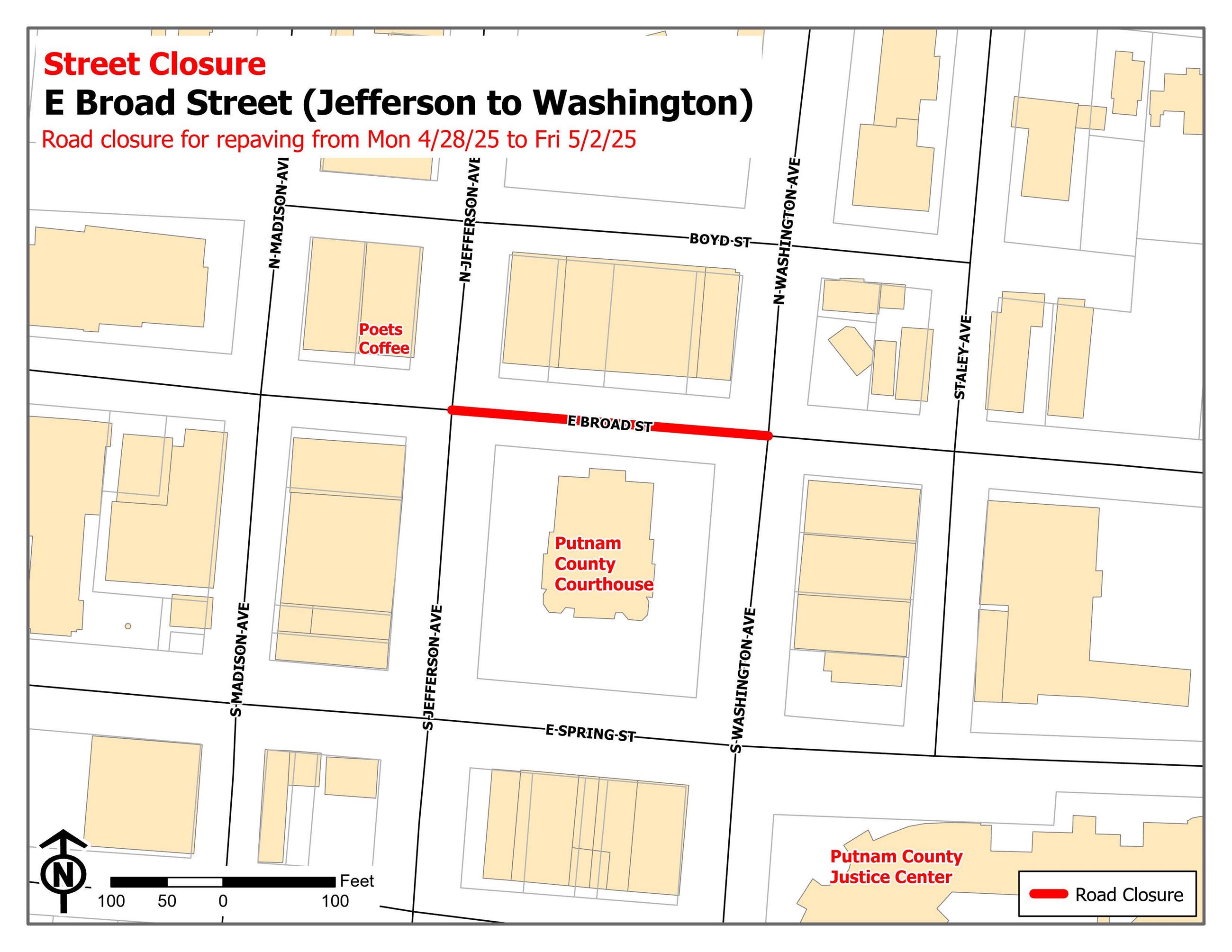 The section of East Broad Street between North Jefferson Avenue and North Washington Avenue will close for street resurfacing from Monday, April 28 to Friday, May 2. This closure will occur daily from 5:00 a.m. to 5:00 p.m. to allow for necessary street resurfacing. The street will reopen every evening for nighttime travel.
