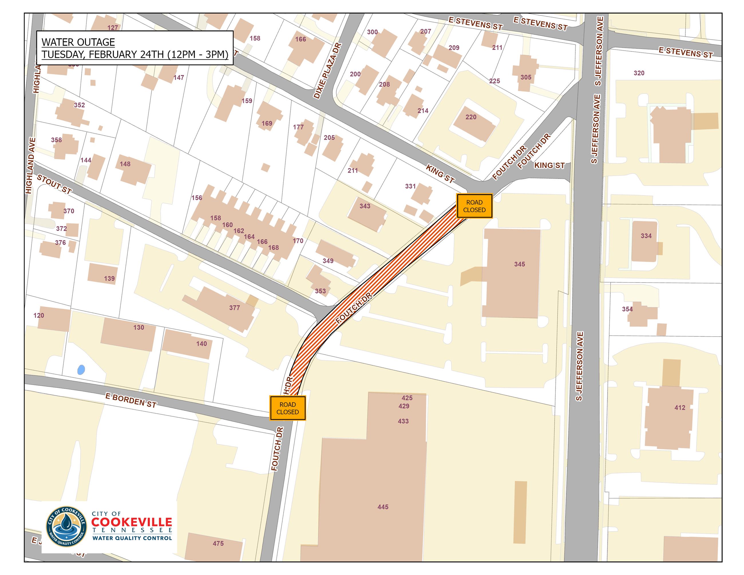 The City of Cookeville Department of Water Quality Control will have Foutch Drive closed between King Street and East Broden Street on Tuesday, February 24th from approximately 12 pm to 3 pm as a contractor works in the area. For questions, please call 520-5227.